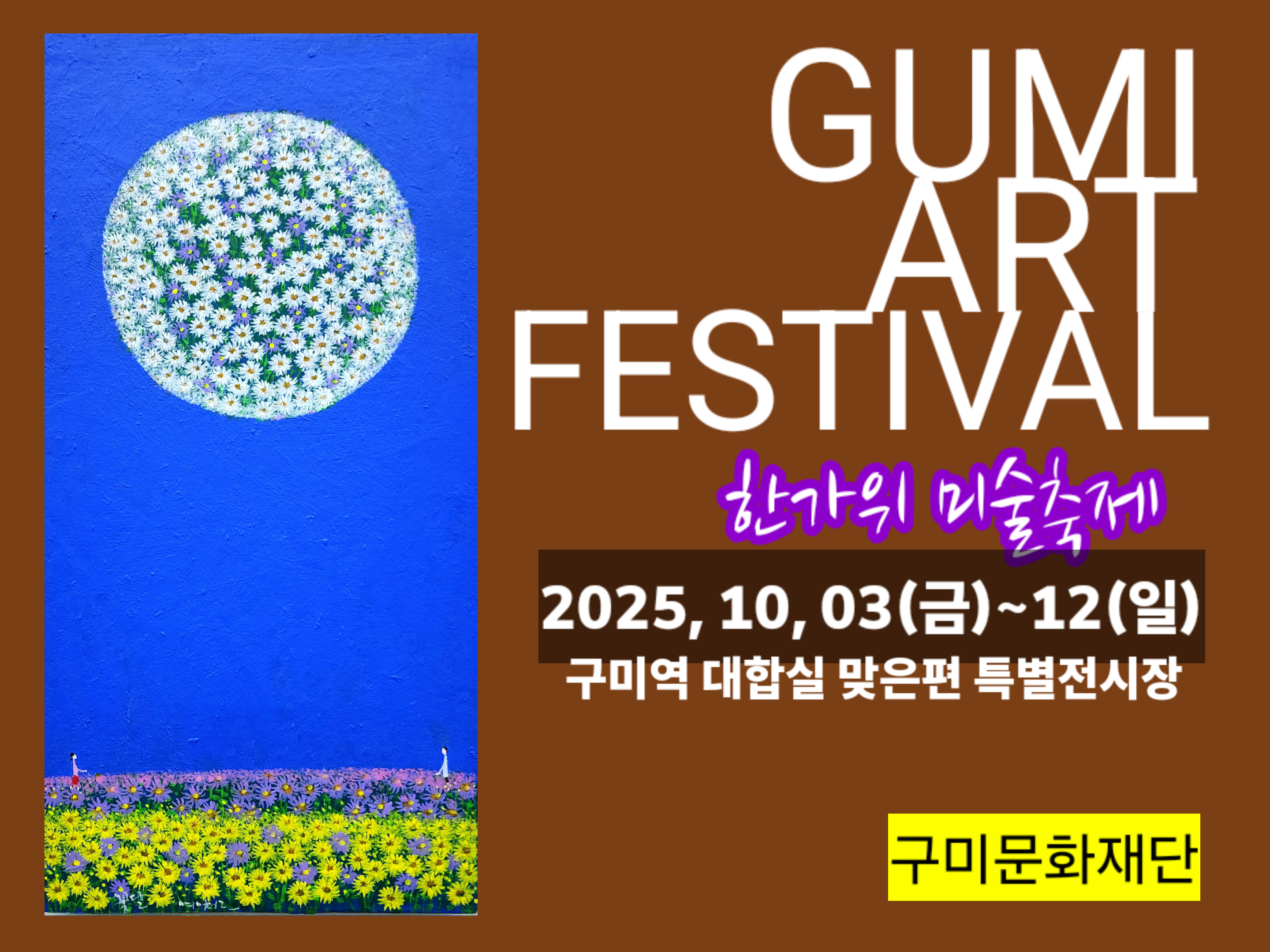 10월 3일(금)부터 12일(일)까지 구미역사 안 대합실 맞은편 특별부스 전시장에서 펼쳐지는 한가위 미술축제 현장으로 모두 퍼뜩 오이소! 특히 대경선을 타시는 분들은 대합실로 들어오면 정면에서 미술장터를 만날수 있어요.